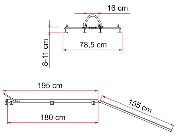 The carry moto system comprises two telescopic aluminium rails. Ideal for installation into the garage facility of your motorhome. Consists of a rail that fixes to the floor of the garage (180cm long X 15cm wide) and a chute which slides easily inside of the fixed rail (155cm long). The rail is supplied with two sturdy straps to fix motorbikes while travelling. It can carry up to 200KG.