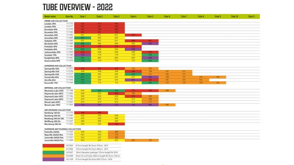 Please view the images on this listing which show a series of coloured charts produced by Outwell over the years. These detail that year’s production of tents and the correct replacement beams for each model of tent.