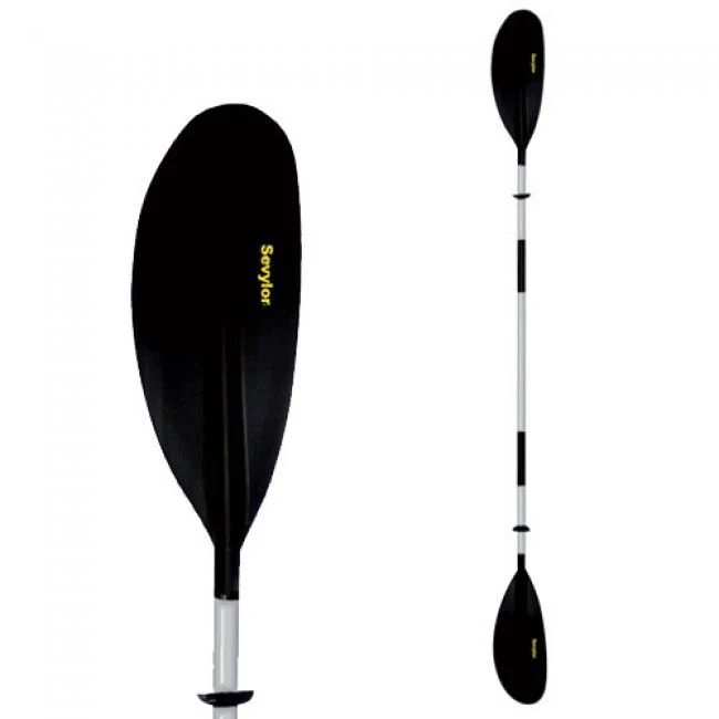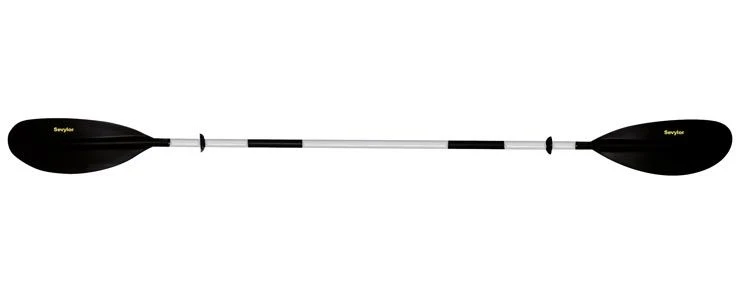 A two-section paddle built for kayaks, this double paddle comes with spoon-shaped fibreglass and reinforced polypropylene blades and an aluminium shaft with cold-weather grip and drip rings.